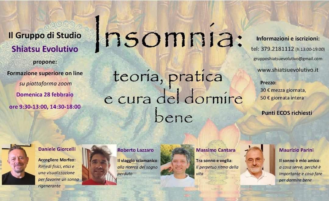 Quattro relatori ognuno con il suo bagaglio di conoscenze condiviso, dallo Shiatsu, alla musica, dall'accogliere Morfeo, al viaggio sciamanico, tra sonno e veglia il sonno è amico mio.