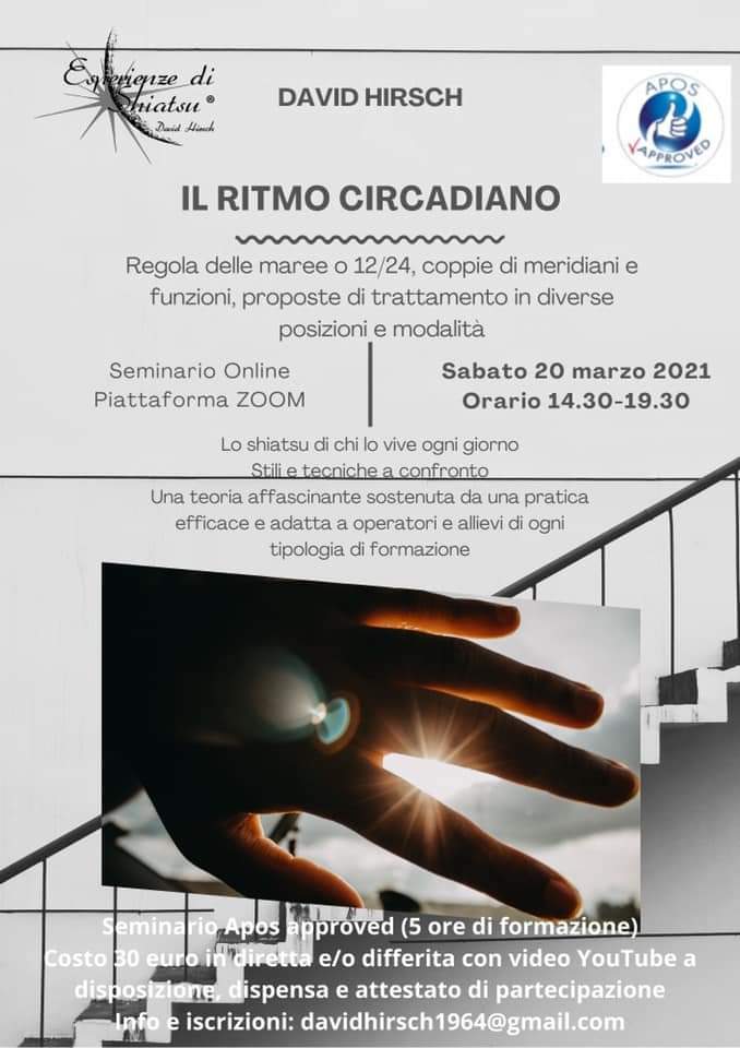 Un nuovo seminario online che, attraverso lo studio del ritmo circadiano, ovvero l’evoluzione quotidiana del flusso del Qi nel corpo, ha presentato varie proposte di trattamento per coppie di meridiani, utilizzando i vari strumenti degli stili shiatsu in rapporto alla zona e alla posizione...cinque ore di lavoro teorico e pratico.